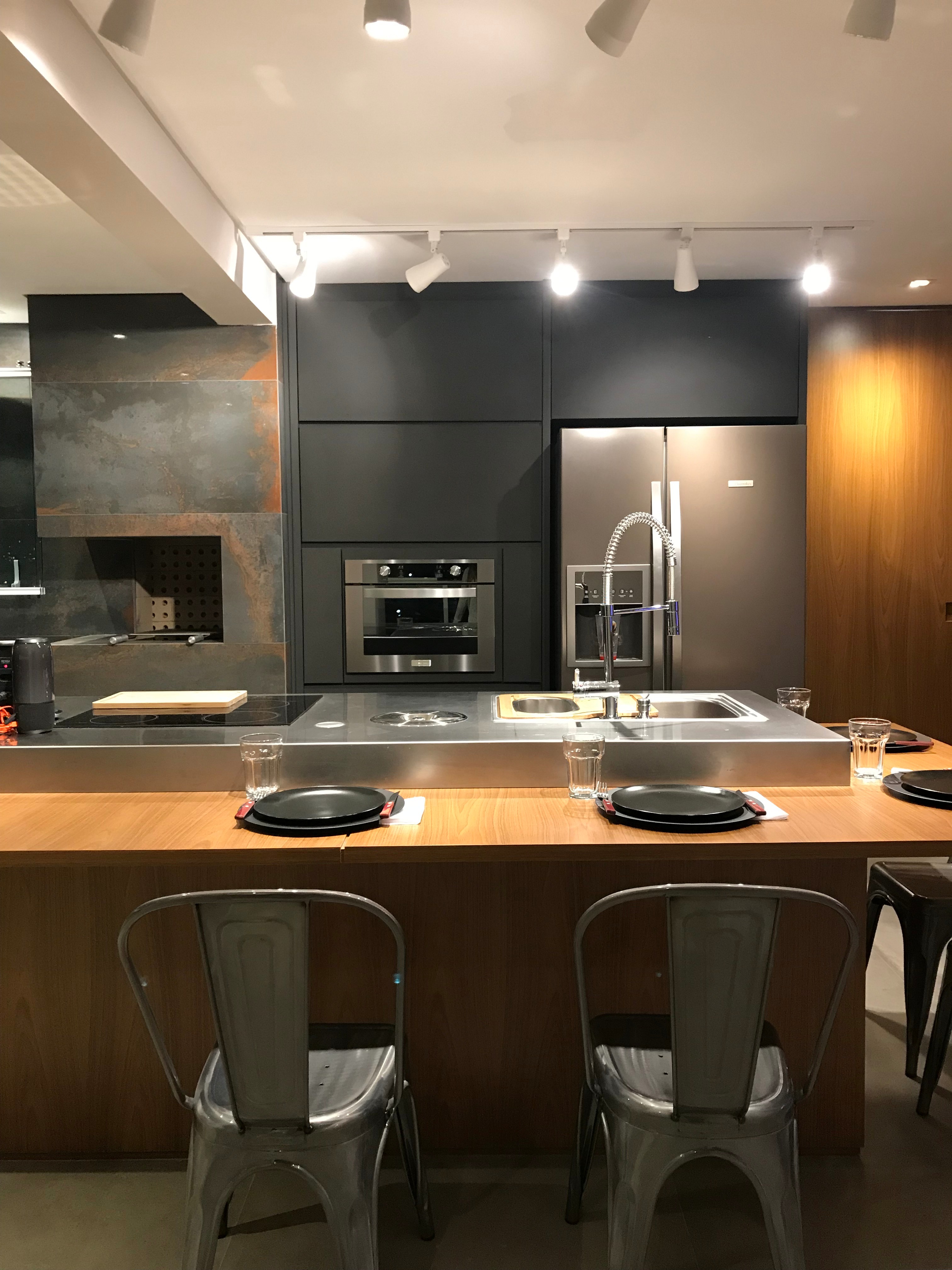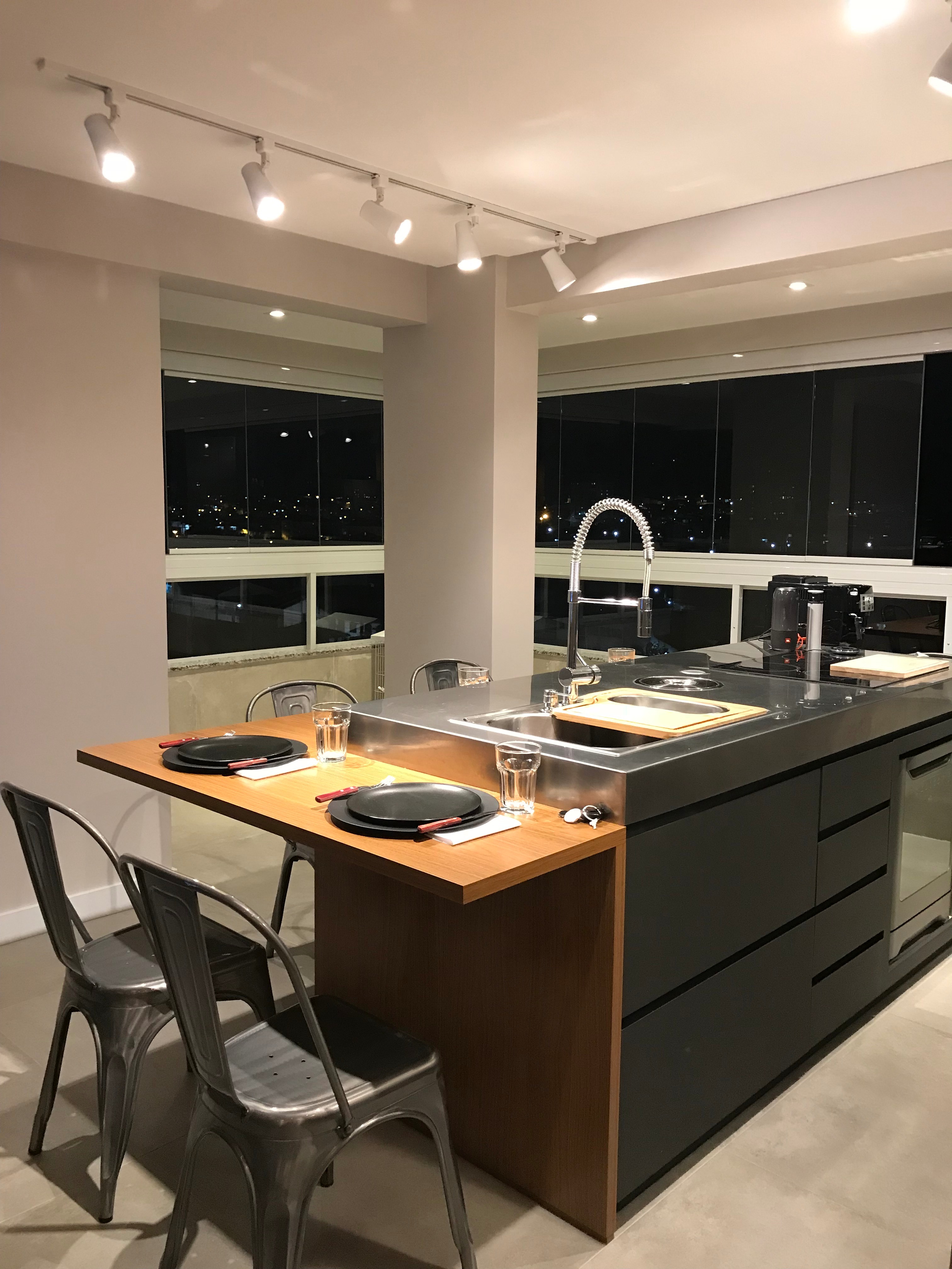 Trocamos a sala pela cozinha criando bancada com ilha e churrasqueira, ampliamos o banheiro master para banheira e bancada com duas cubas, e criamos um lavabo social.